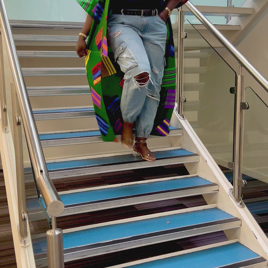 Adesuwa is a vibrant fusion of heritage and modern flair. This open-front kimono bursts with geometric patterns in purple, yellow, red, and blue, layered over a rich green base that evokes nature and vitality. Styled over a black top and light denim, she transforms everyday wear into a cultural statement.