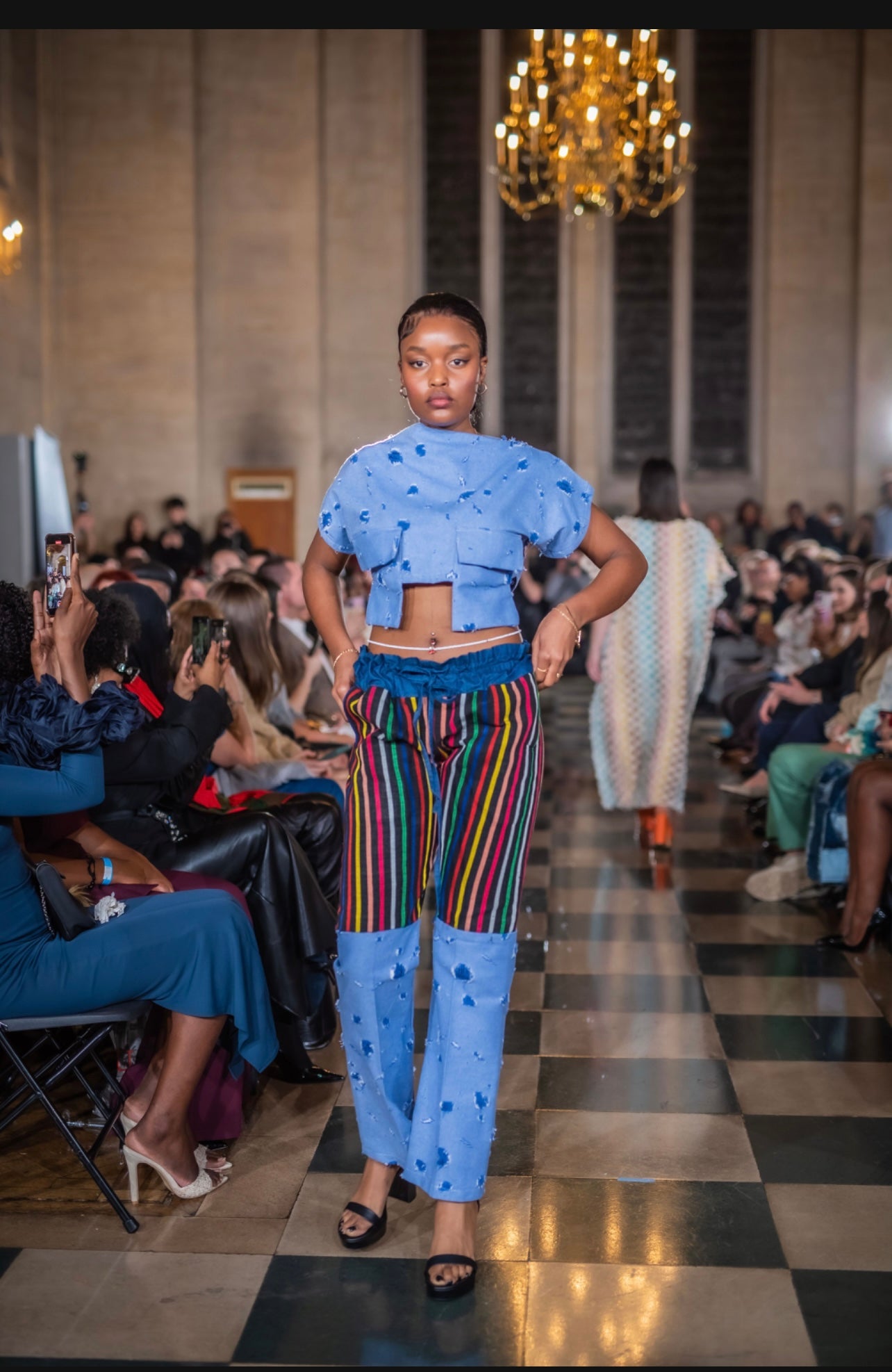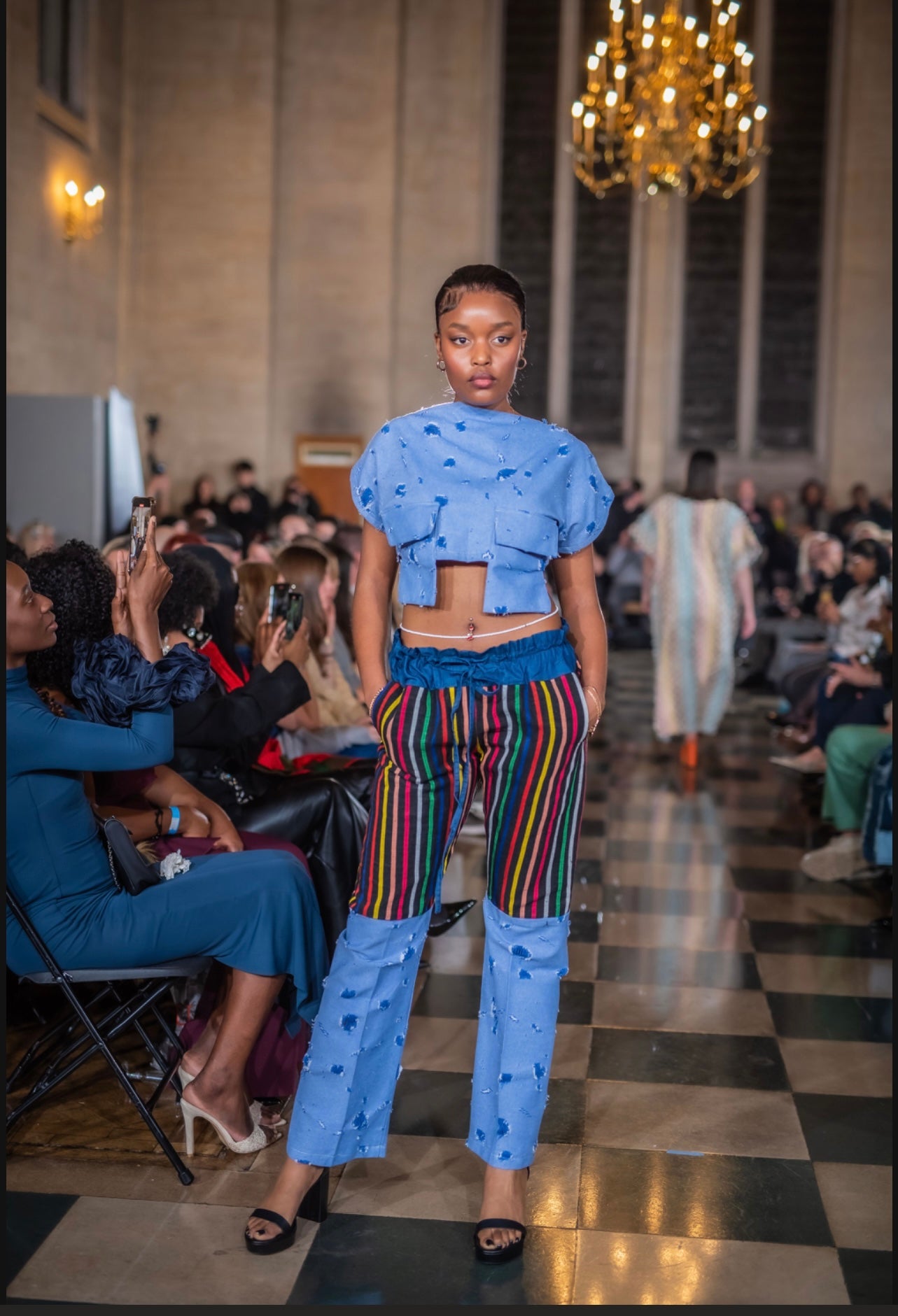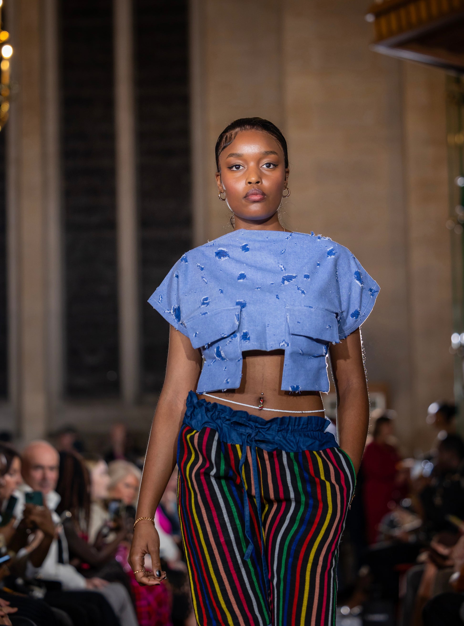Unleash your bold, avant-garde style with this two-piece ensemble that flawlessly fuses texture and cultural heritage. The cropped, short-sleeved top in light blue features a distressed texture, adding an edgy and contemporary vibe. The matching light blue denim pants continue the distressed theme on one leg, while the other leg stuns with vibrant vertical stripes crafted from traditional aso-oke fabric. This unique blend of modern design and cultural artistry makes the set a striking choice for runway appearances or high-profile events. Perfect for fashion-forward individuals who love to celebrate heritage through bold statements.