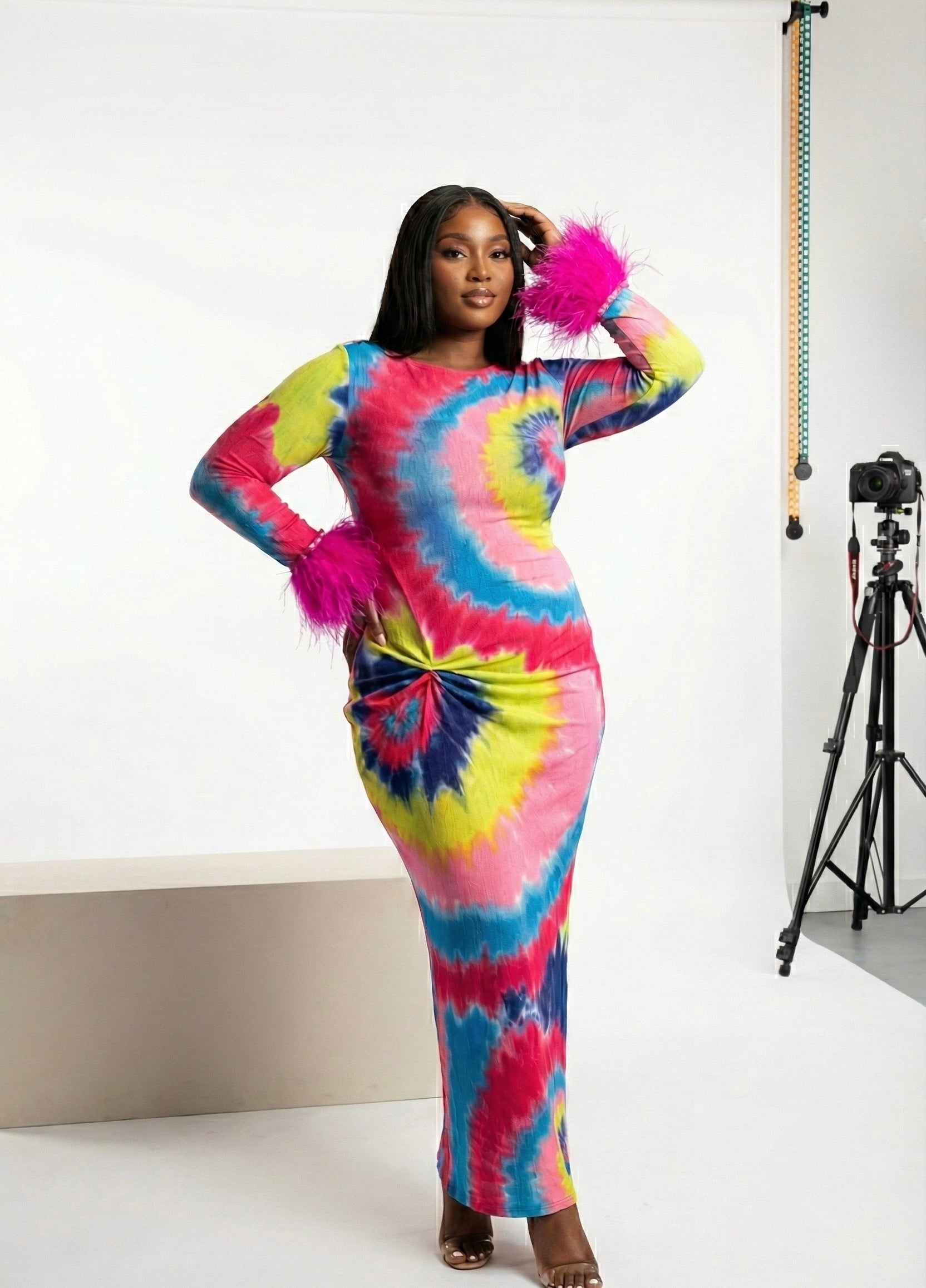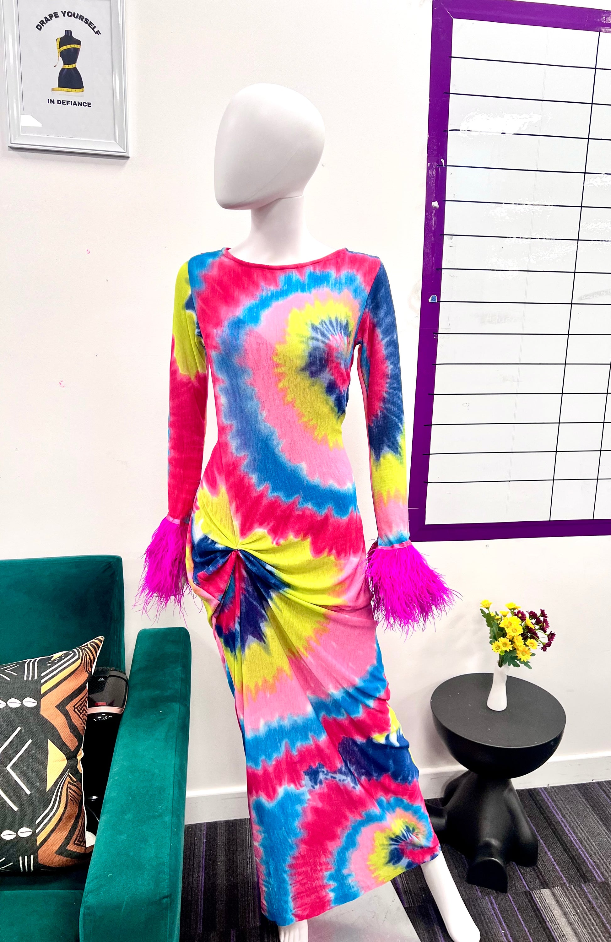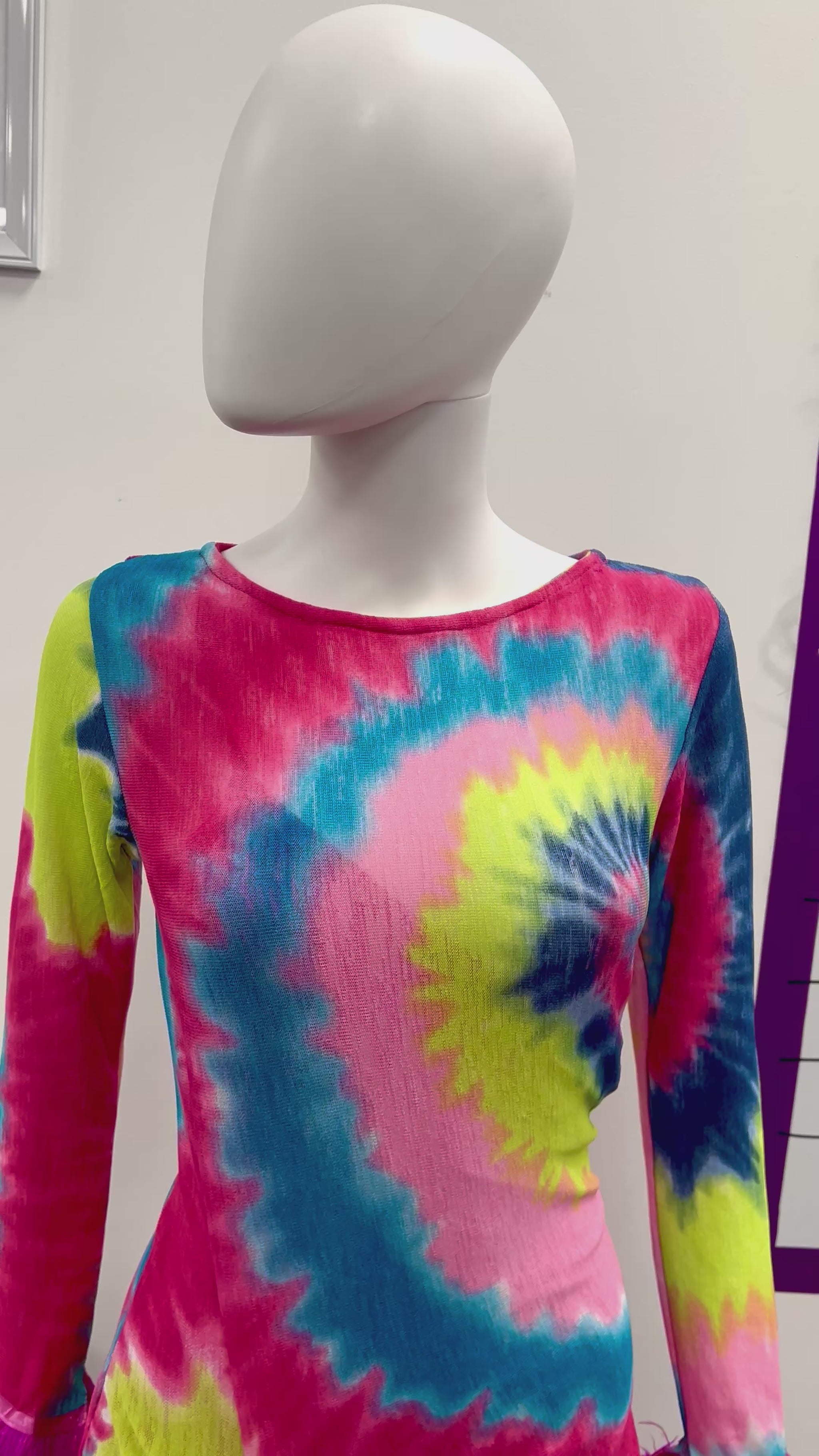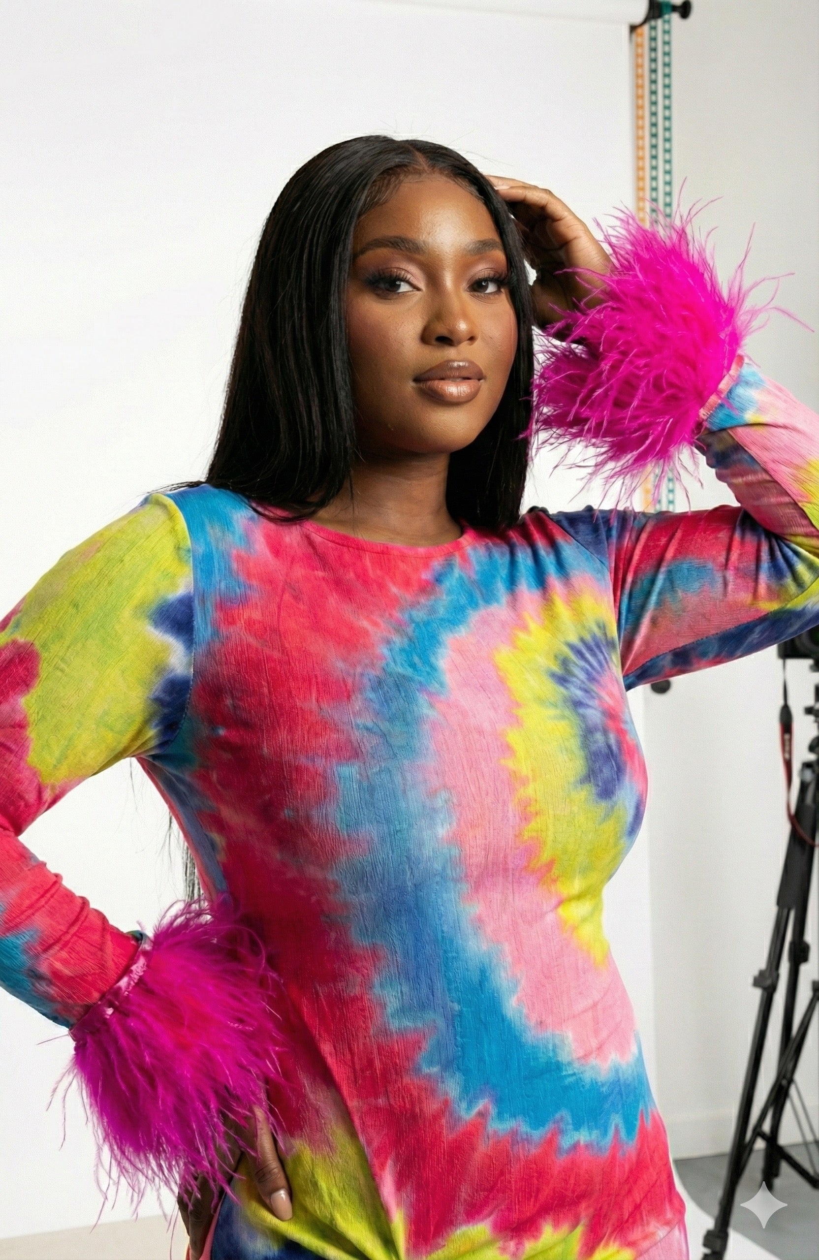 Banke is a bold, body-celebrating silhouette crafted from breathable stretch mesh. Its hypnotic spiral tie-dye swirls in pink, yellow, blue, and purple—each hue chosen to radiate joy and defiance. The ruched side detail flatters your form, while the feathered cuffs add movement and drama with every gesture.