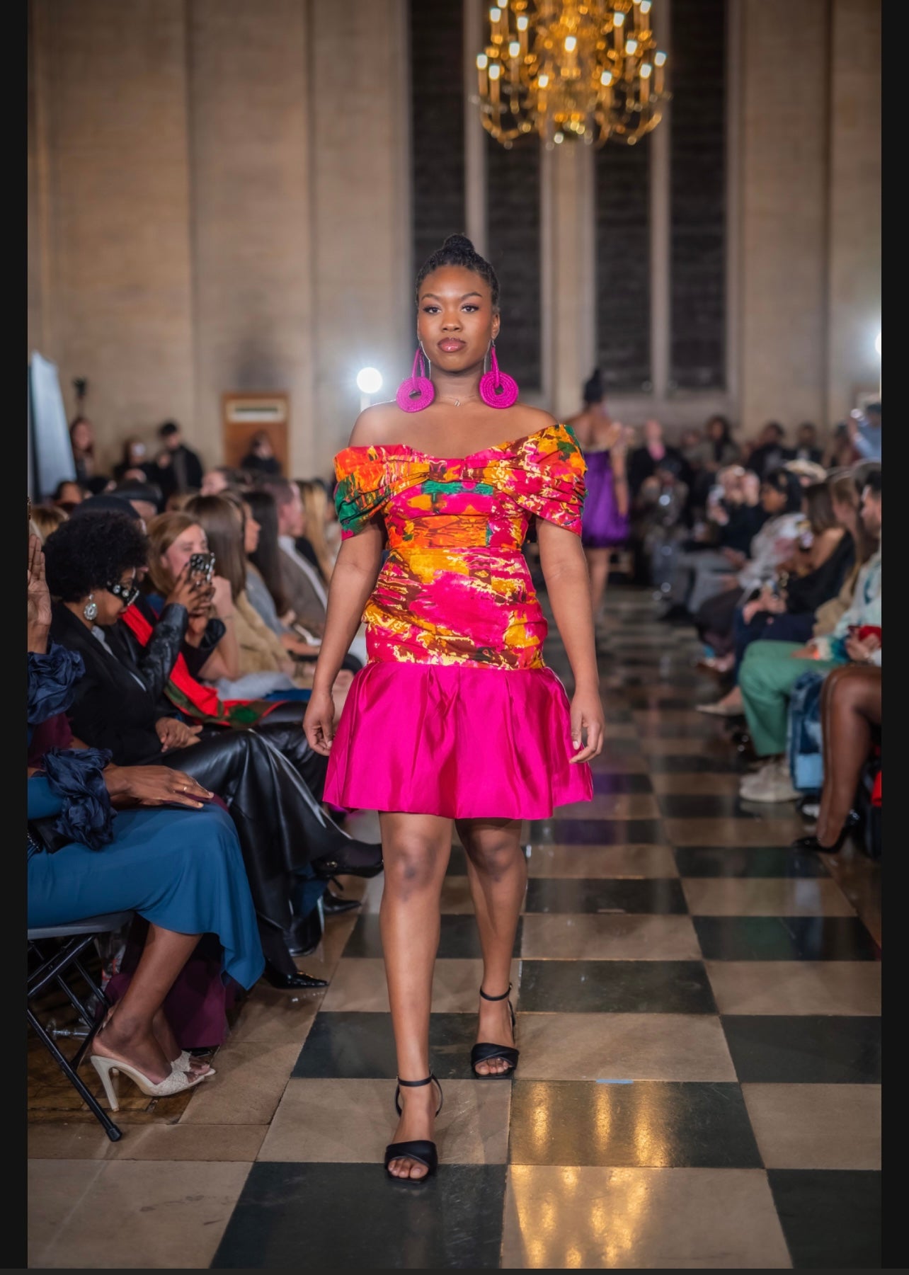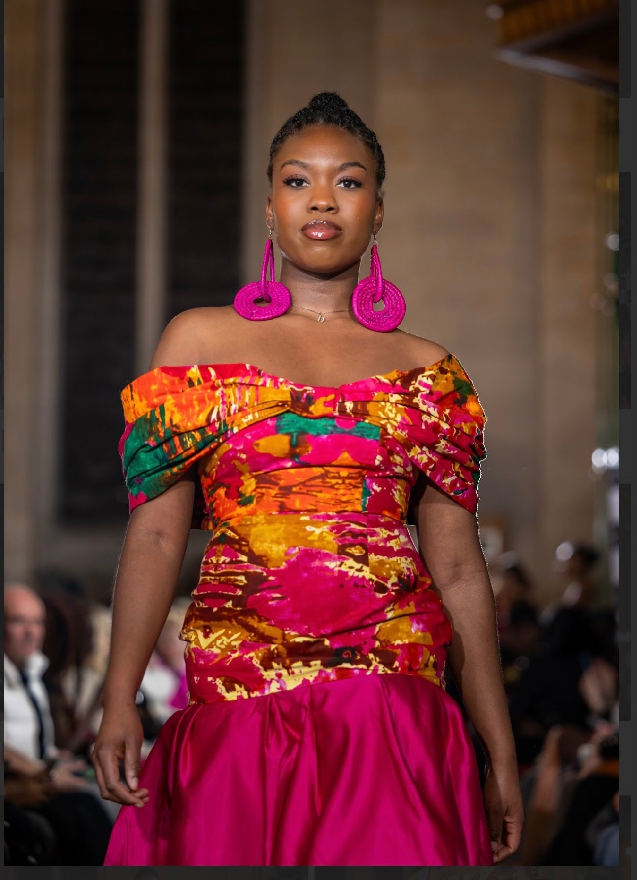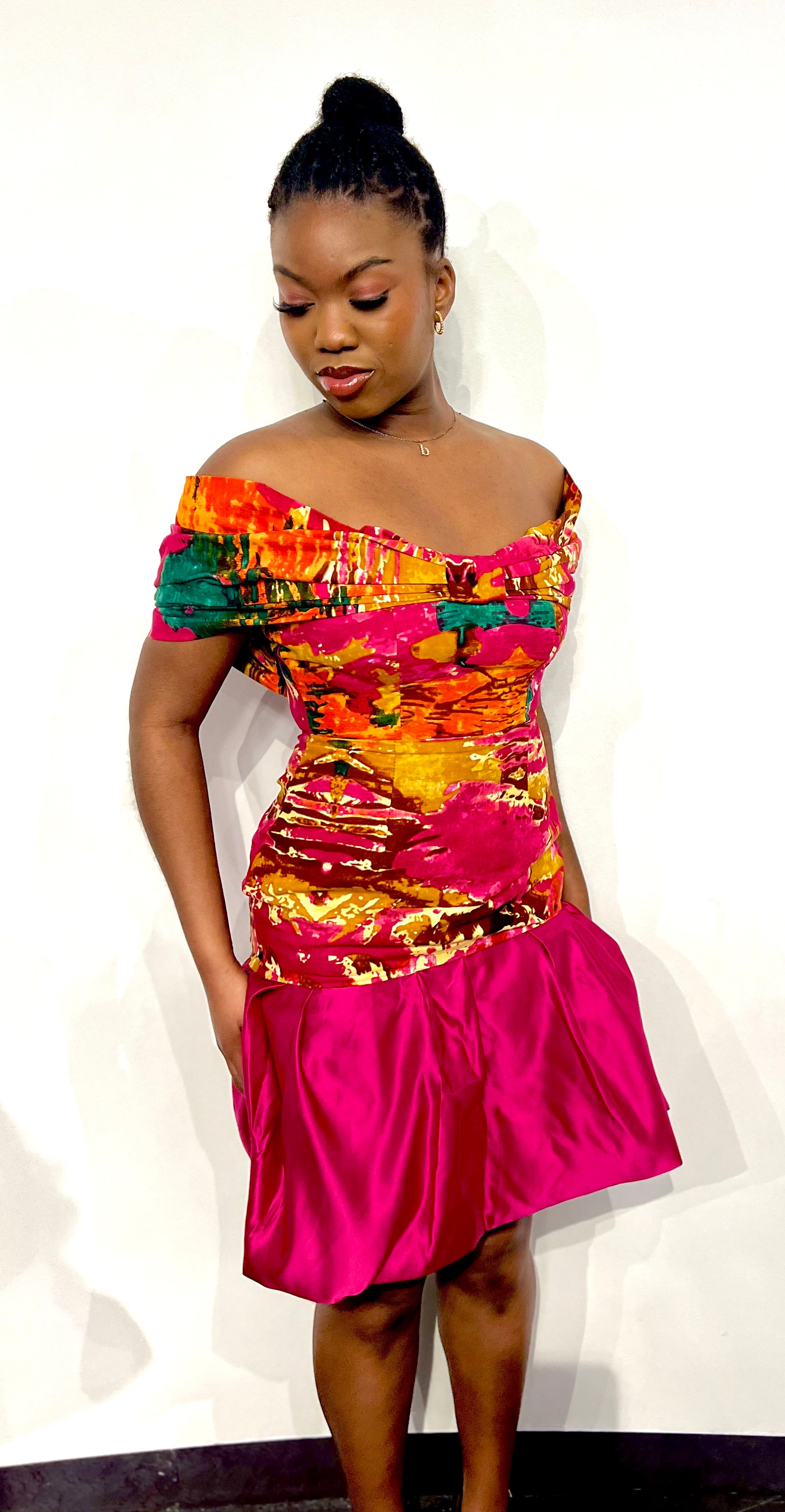 Turn heads with this stunning Kiki dress that exudes bold elegance. The bodice showcases a vibrant abstract pattern in shades of red, orange, yellow, green, and pink, beautifully complemented by ruched detailing for a flattering fit. The voluminous bright pink skirt brings a playful yet sophisticated flair, perfect for making a statement. Featuring corset lacing at the back, this dress combines charm and adjustability, ensuring a perfect fit for any occasion.