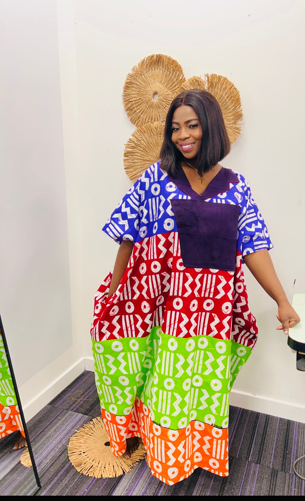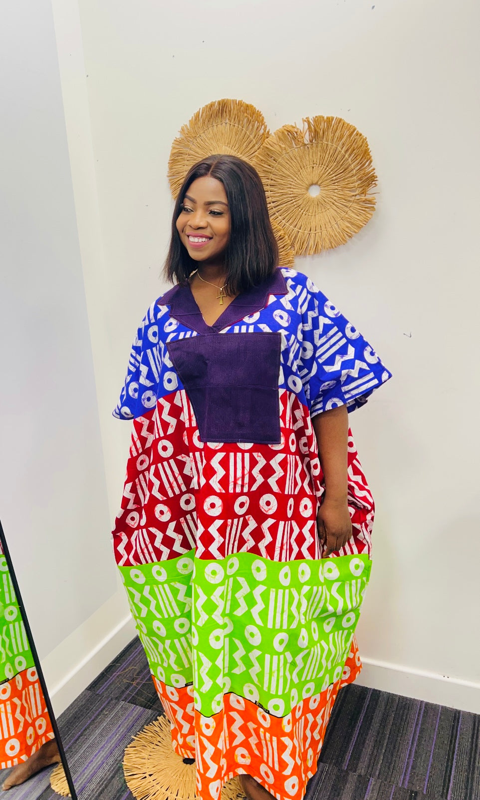 A vibrant boubou crafted from three panels of Adire-inspired Ankara fabric—sky blue, crimson, and emerald—each symbolizing clarity, passion, and growth. A deep plum chest patch adds grounding and elegance. Nya flows with ease and presence, blending tradition with modern flair.