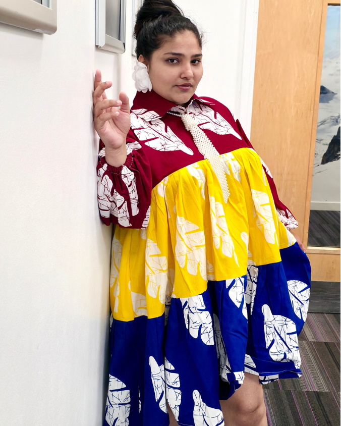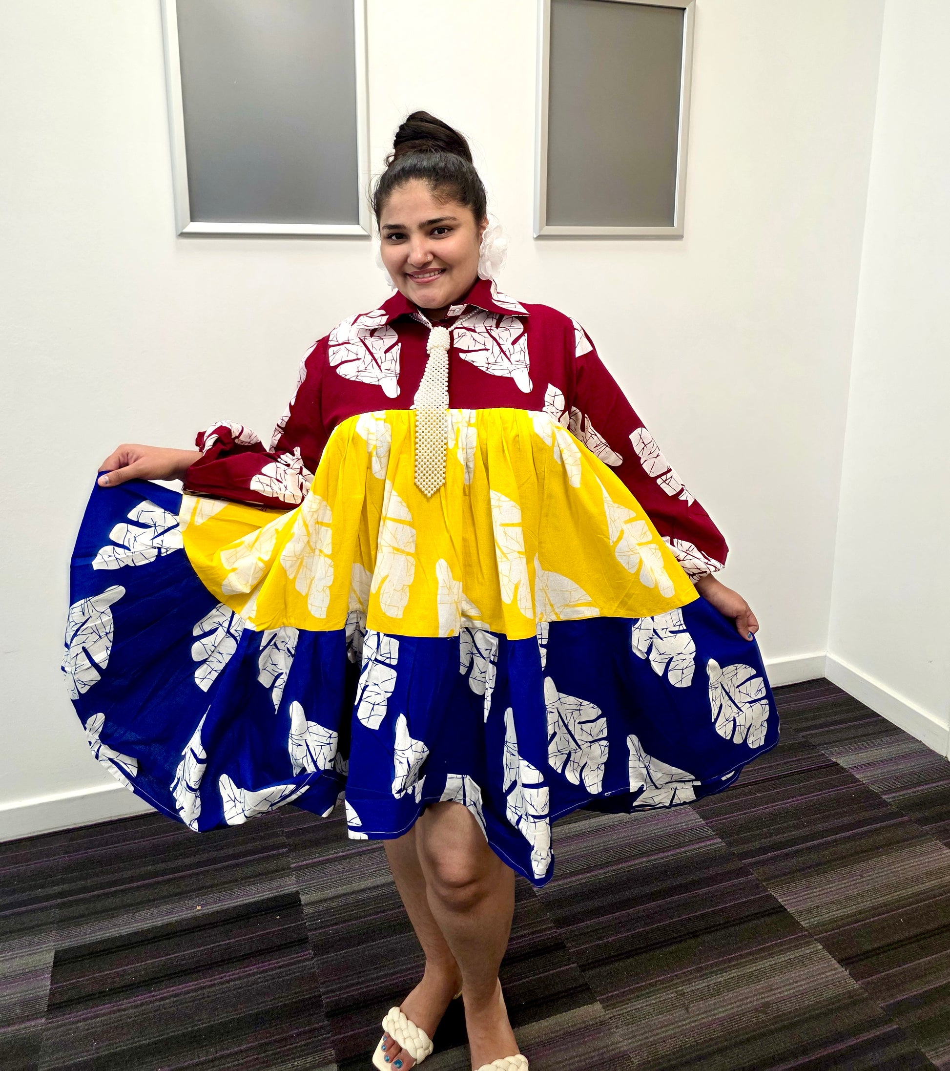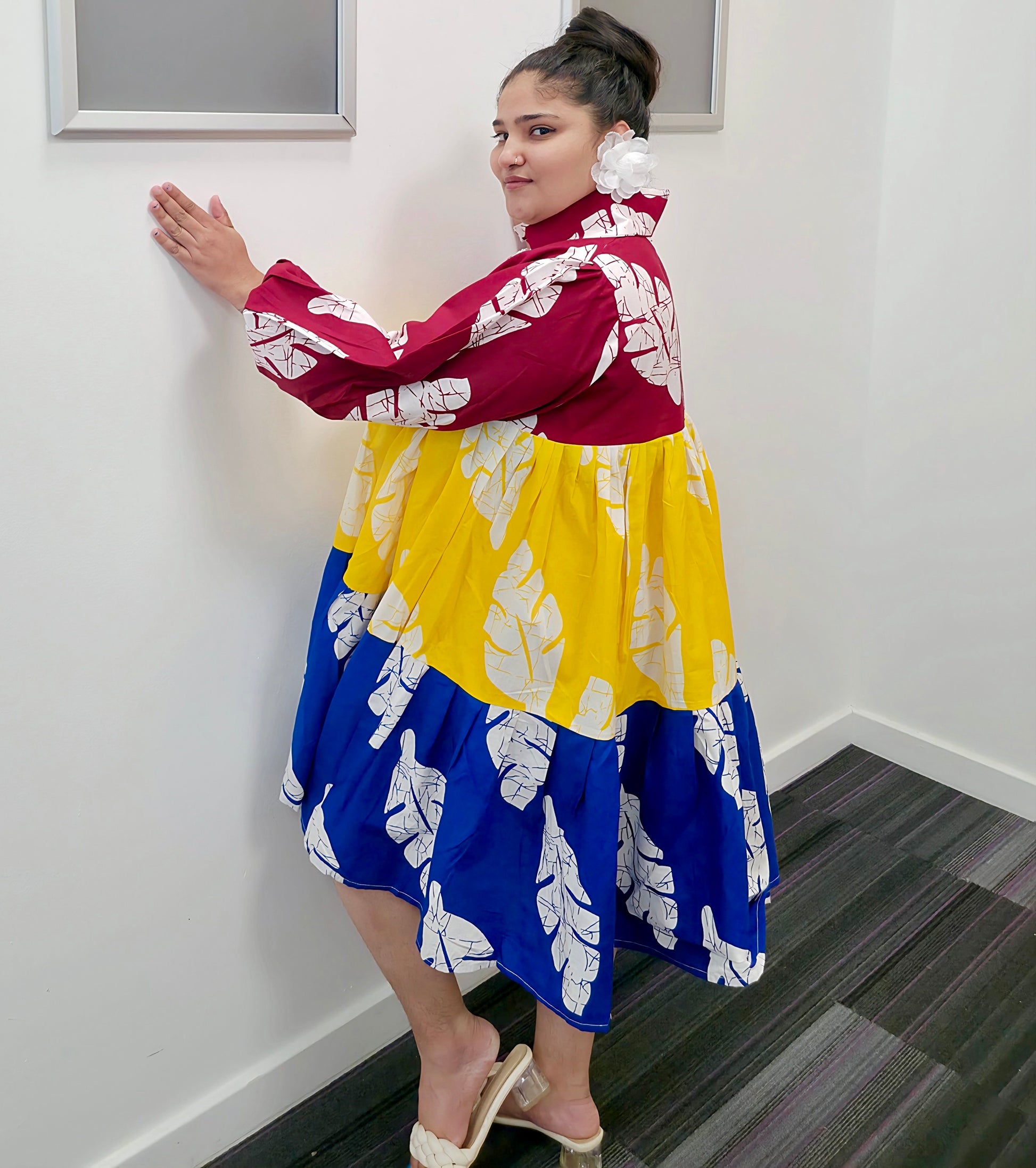 Oreke is a celebration of color, movement, and cultural storytelling. Designed with three distinct panels—maroon, yellow, and blue, each adorned with delicate white leaf motifs—this dress creates a visual rhythm that’s both playful and regal. The wide flare silhouette invites drama with every step, while the wearer’s pose reveals the full artistry of the piece.