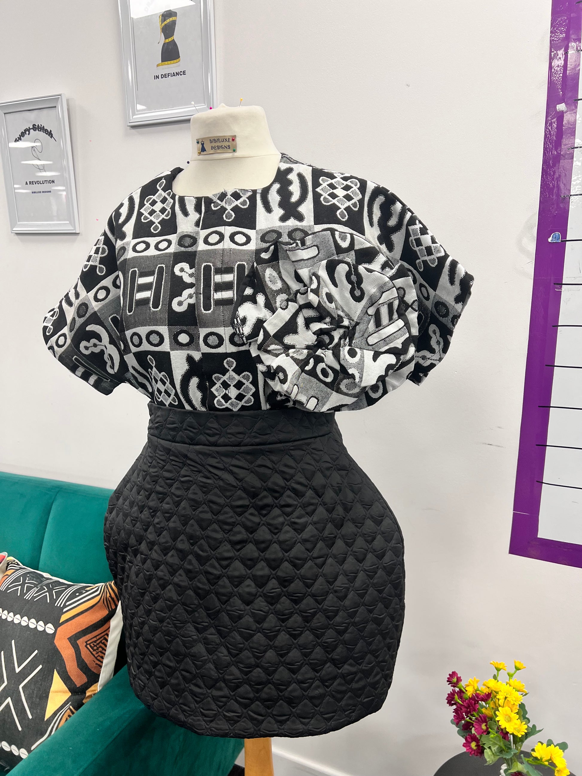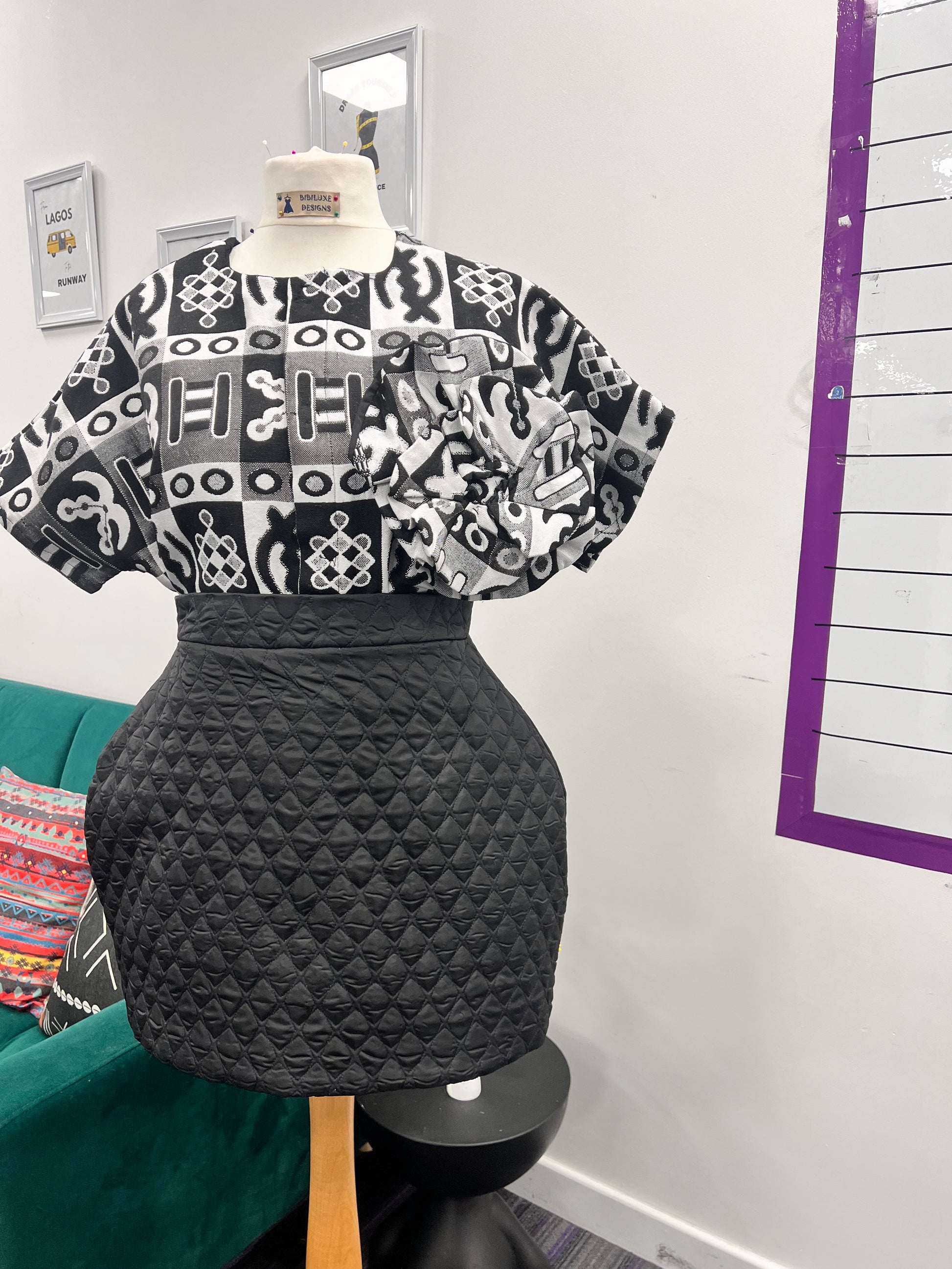 A structured black skirt with quilted texture and a high-waist silhouette. Designed to pair effortlessly with bold tops or stand alone as a sculptural statement. Elegant, versatile, and rooted in Afro Luxe styling.